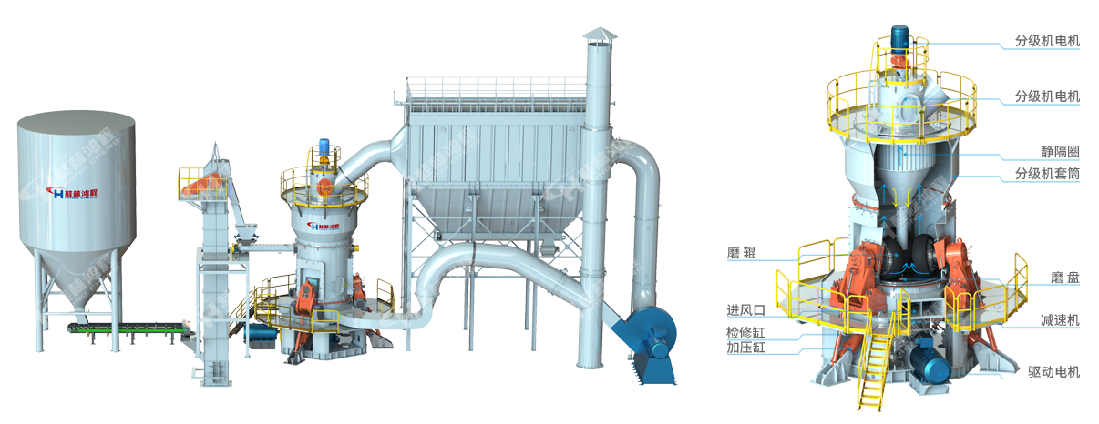 水泥生料立磨結構由立磨主機、存料罐體、皮帶輸送機,定量給料機,料斗、液壓站結構、送風管結構和脈沖除塵裝置構成。